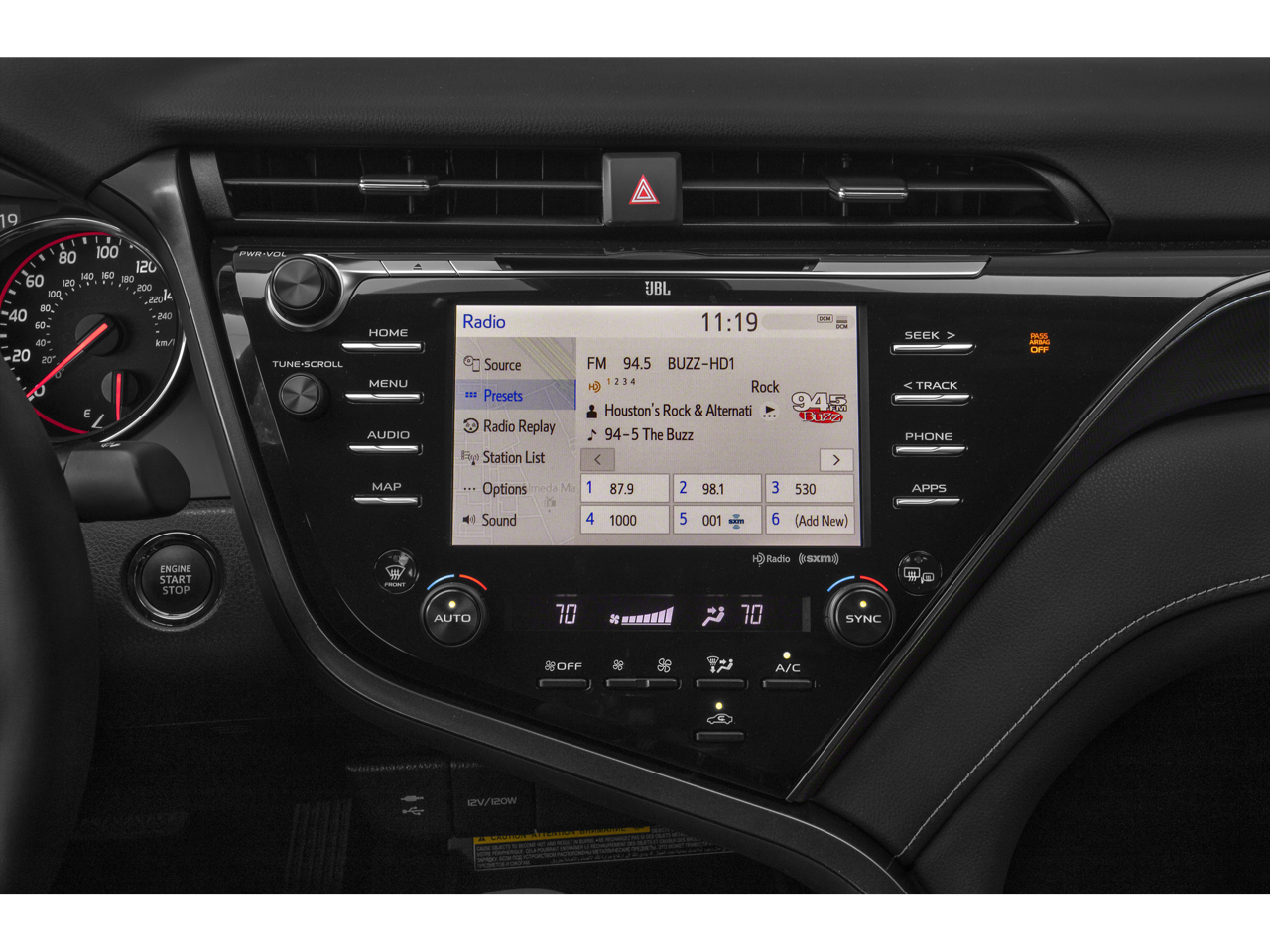 - Radio: Entune 3.0 Audio Plus w/App Suite -inc: 6 speakers, 8" touchscreen, AM/FM/HD Radio, CD player, auxiliary port, USB media port, 2 USB charge ports, advanced voice recognition, hands-free phone capability and music streaming via Bluetooth® wireless technology, Scout GPS Link compatible w/up to 3-year trial, Siri Eyes Free, Apple CarPlay compatible, SiriusXM satellite radio w/3-month All Access trial and Entune 3.0 Toyota Connected Services including Safety Connect w/3-year trial, Service Connect w/3-year trial, Remote Connect w/6-month trial, Wi-Fi Connect Powered by Verizon w/up to 2GB within 6-month trial and Qi-compatible wireless smartphone charging